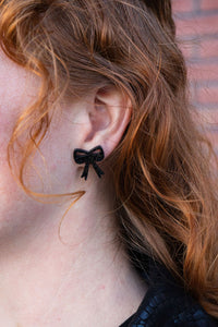 Style meets spooky with these black glitter bow studs. Get ready to slay the day with these wickedly cute earrings.
