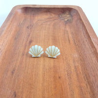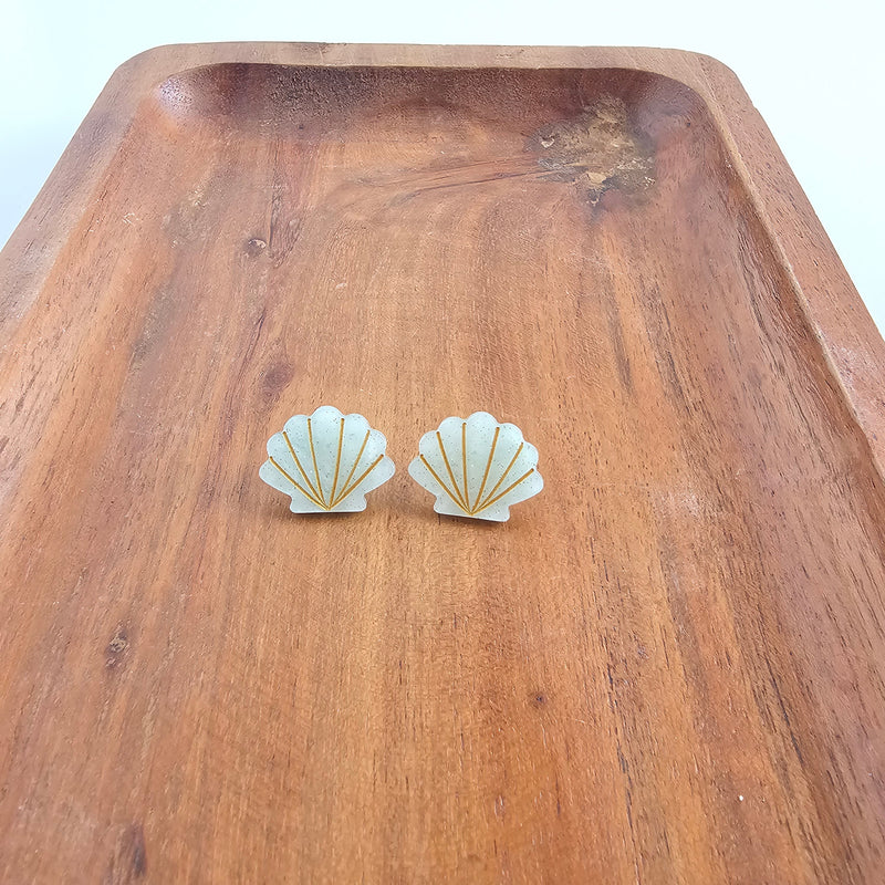 Add a touch of whimsy to your look with our Seashell Studs in Seafoam Pearl. These shimmery acrylic earrings feature golden accent lines for a playful and chic style. Perfect for any beach lover or mermaid at heart.